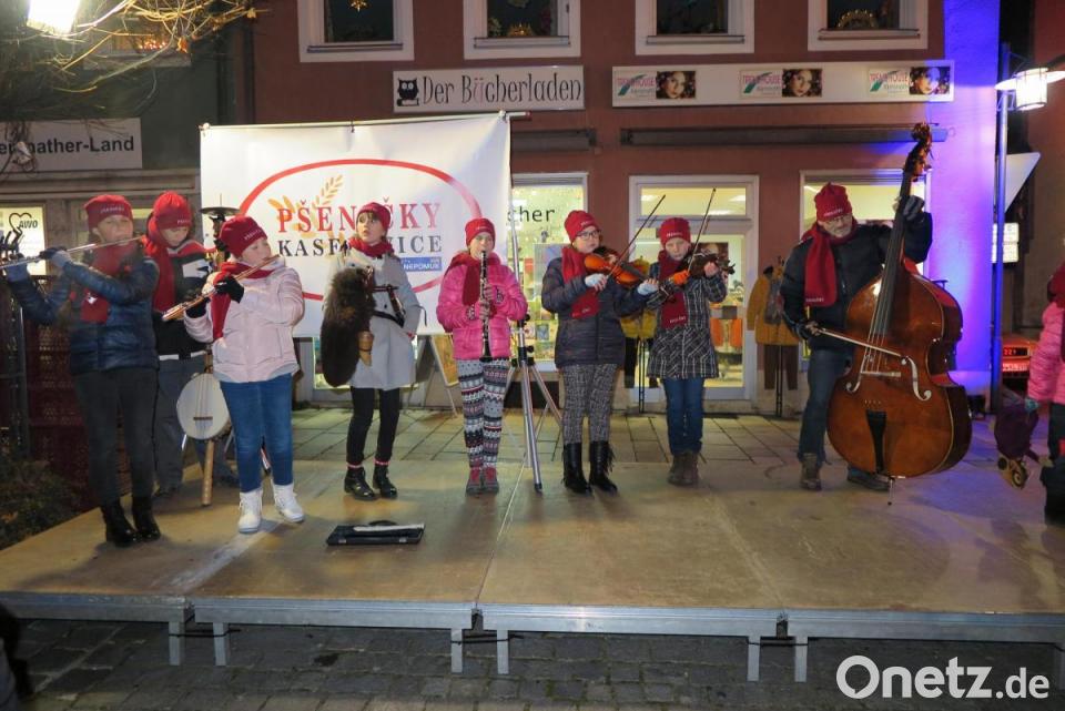 Überraschenden Besuch aus der Partnerstadt Nepomuk erhielt die Stadt Kemnath beim Candlelight Shopping. Eine Gesangsgruppe trug auf dem Podium bei der Stadtpfarrkirche Volks- und Weihnachtslieder aus Tschechien vor. Eine Instrumentalgruppe mit Geigen, Querflöten, Klarinetten und Kontrabass begleitete die jungen Sänger. Ein Dudelsack lieferte dazu die passenden Borduntöne. Alle spielten und sangen auswendig. Tapfer trotzten sie der Kälte.