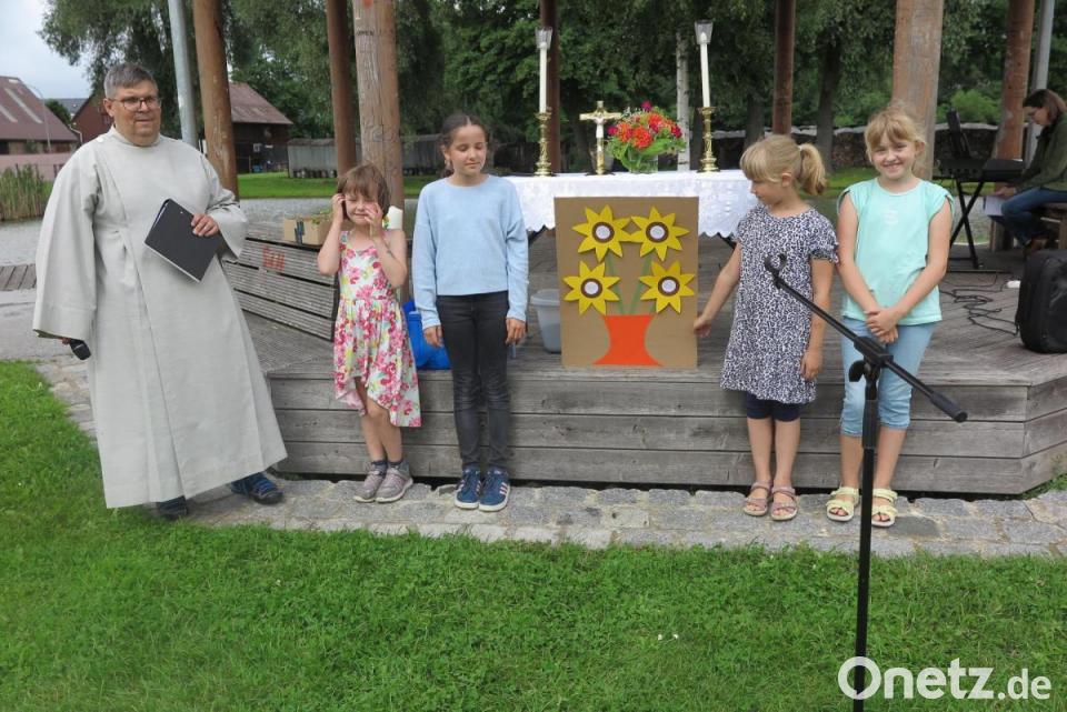 "Eine Sonnenblume erzählt" war das Thema eines Freiluftgottesdienstes auf dem Eisweihergelände. Gemeindereferent Jochen Gößl entzündete im Pavillon die Jesuskerze und befestigte daran eine Sonnenblume.