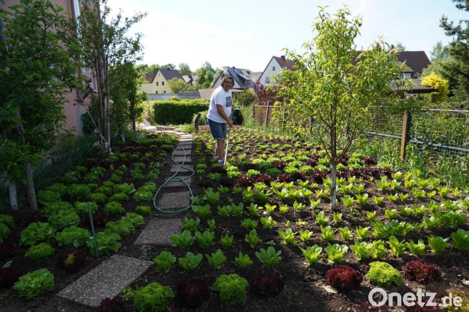 Bunte Blumen sucht man im Garten von Andrea Statile vergebens. Dafür stechen einem die unzähligen, grünen und violetten Salatpflanzen ins Auge. Auf über 100 Quadratmetern pflanzt der Kemnather - den die meisten Gino nennen - über das Jahr verschiedenen Salatsorten an. "Jeder Zentimeter wird ausgenutzt", sagt Statile. Sogar zwischen den Gewächshäusern, in welchen Gurken, Tomaten und Paprika wachsen, wechseln sich Eisberg- und Kopfsalate ab. Reihenweise sind die unterschiedlichen Entwicklungsstadien zu erkennen.
