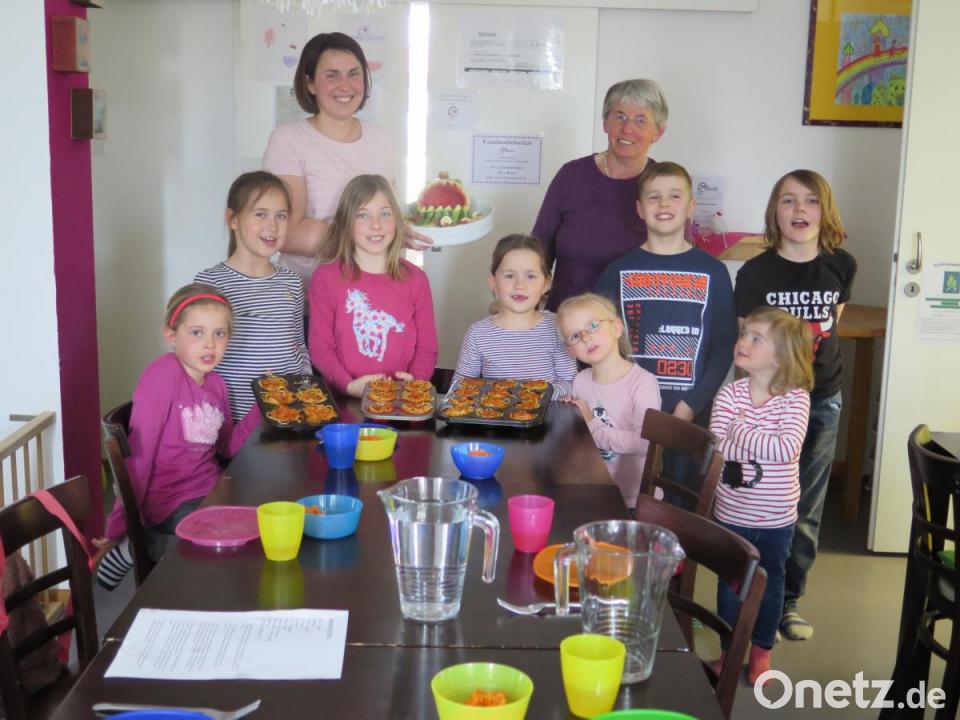 Für einen Melonenhai als Nachspeise verpasste Franz einer Melone ein aufgerissenes Maul mit spitzen Zähnen. Die Kinder füllten es mit Obstsalat, den sie selber gemacht haben. Als der Tisch schön gedeckt war, ließen sich alle die Köstlichkeiten schmecken, die sie in zwei Stunden gezaubert hatten. Zwischendurch bekamen die Kinder von der Ernährungsexpertin Tipps für eine gesunde und abwechslungsreiche Ernährung.