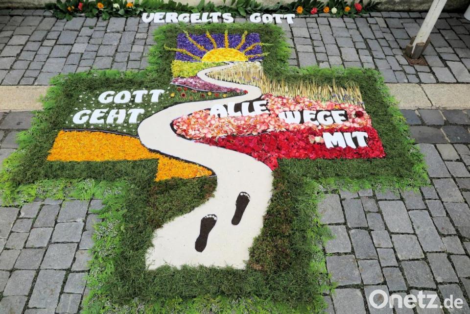 Vor dem Gottesdienst hatte sich ein langer Kirchenzug von der Sparkasse über den Stadtplatz zur Stadtpfarrkirche bewegt. "Vergelt's Gott! Gott geht alle Wege mit" stand in großen Lettern auf dem farbenprächtigen Blumenteppich, den der Katholische Frauenbund Kemnath vor dem Eingang zur Stadtpfarrkirche gelegt hatte.