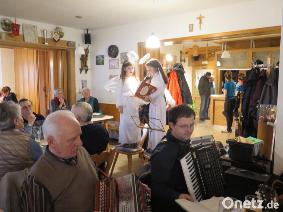 Am Ende des besinnlichen Teils wünschten die beiden Engelein allen "Frohe Weihnachten" und teilten an die treuen Musikanten und Volkssänger Weihnachtsgeschenke aus. Monika Fink dankte den Wirtsleuten Bruno und Monika Fink für ihre Gastfreundschaft mit einem Geschenk.