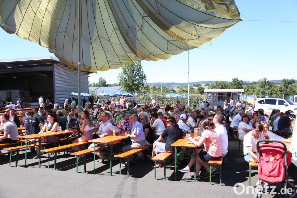 Mitarbeiter feierten mit ihren Familienangehörigen und Pensionären unter einem Fallschirm als luftiges Zeltdach am Eingangsbereich zum Mechanikzentrum. Daneben war eine große Bühne für die Band "Goodlands" und die Jazz-Band "Old Riverhouse" aus Erlangen. Gegenüber kümmerte sich der Kemnather Sportverein wieder um den Ausschank.
