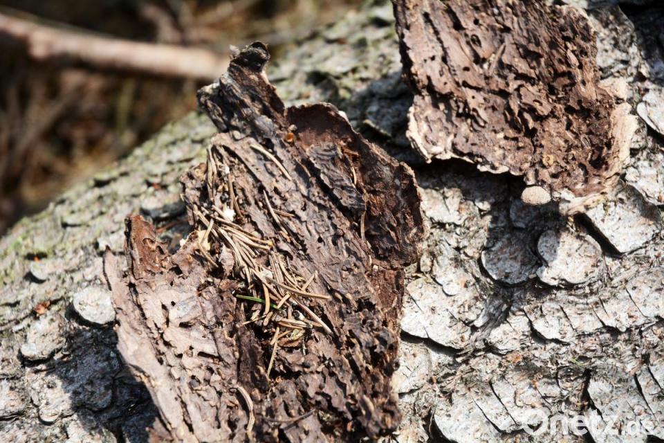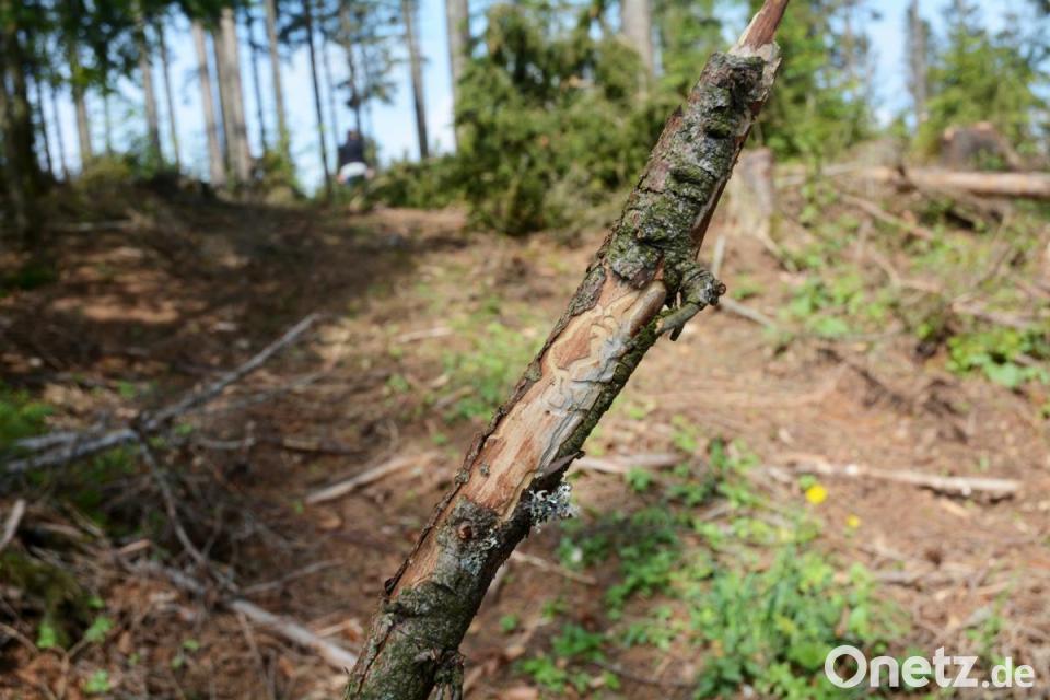 Zu Schödels Bereich gehört unter anderem der Wald bei Schadenreuth. Dort haben die beiden Schädlinge bereits zugeschlagen: Einige Baumwipfel ragen trocken heraus, unter den Baumrinden sind kleine Rillen zu sehen. Buchdrucker und Kupferstecher waren hier schon am Werk. „Wenn ich das sehe, dann wird mir richtig schlecht“, sagt Schödel bei einem Kontrollbesuch vor Ort und deutet auf Baumkronen, die sich schon rotbraun verfärbt haben. „Das Holz sehen wir noch fallen“, ist sich Schödel sicher.