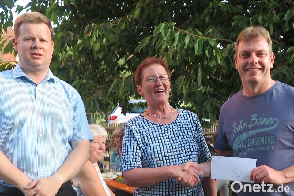 Beim Grillfest des Katholischen Frauenbundes im Pfarrheimgarten übergab Rita Ponnath an Holger Pühl eine Spende in Höhe von 500 Euro. Das Geld stamme vom Verkauf von Palmbuschen und Bastelarbeiten beim Patrozinium Mariä Himmelfahrt, erklärte sie.