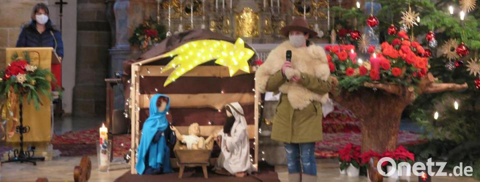 Am ersten Adventssonntag haben die Kinder in der Pfarrmesse in der Stadtpfarrkirche den Hirten Samuel kennengelernt. Seitdem begleitete er sie durch den Advent auf dem Weg nach Bethlehem. An jedem Adventswochenende erzählte er seine Geschichte weiter. Während der Reise nach Bethlehem spürte er, dass etwas ganz Tolles passieren wird. „Viel hat unser Samuel in den vergangenen vier Wochen erlebt“, sagte Silvie Bauer in Gestalt des Hirten. Kurz vor Bethlehem schlug er mit den anderen Hirten sein Nachtlager auf. Plötzlich wurde es mitten in der Nacht hell. Engel erschienen und beruhigten die ängstlichen Hirten: „Fürchtet euch nicht! Ein Kind ist heute geboren. Es ist Christus, der Herr.“