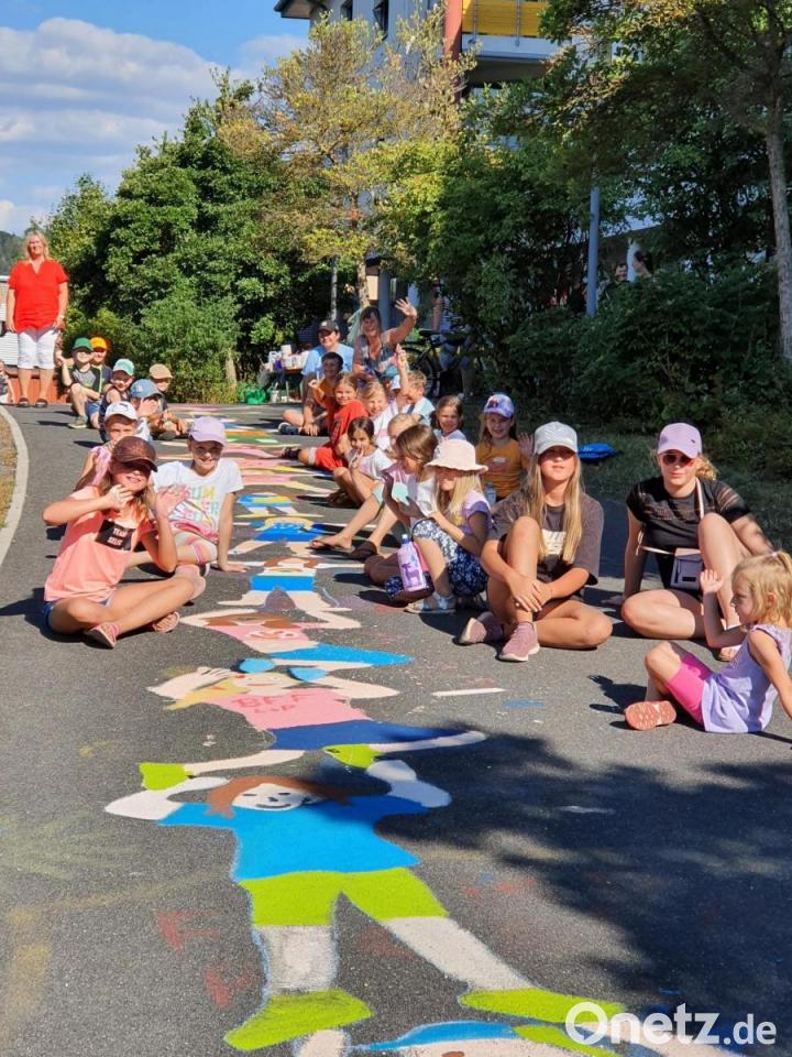 25 Kinder machten beim Ferienprogramm "Straßenkunst" der Gruppe "Malwas" mit. Dabei durften sie den Fußweg zwischen Krankenhaus und Spielefisch mit einer bunten Straßenbemalung verschönern. Jedes Kind konnte sich dort selbst in Lebensgröße verewigen. Dazu legte es sich auf die Straße und wurde auf dem Asphalt umrandet. Danach durfte es sich dann selber ausmalen.
