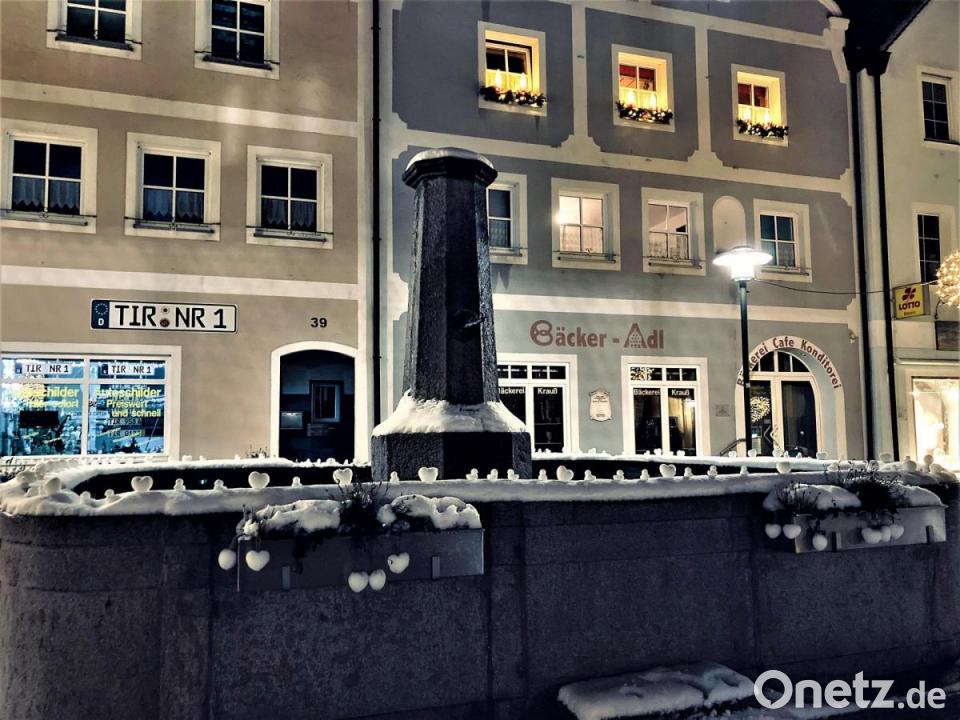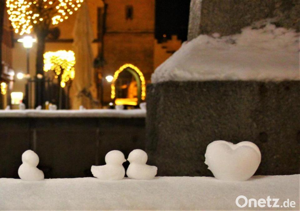 Unzählige Herzchen und Entchen hatten Susanne und Stefan Krauß kurzerhand mittels Kunststoffformen gepresst und großflächig verteilt. "Es war eine spontane spinnerte Idee", meint Stefan Krauß. Die gepressten Gebilde aus Schnee fanden sich unter anderem auf dem Brunnen, an den Blumenkästen und als "Schmuck" am großen Christbaum. Sogar die Fensterbretter der Stadtverwaltung und des Polizeigebäudes wurden damit verziert. Leider waren die besonderen Hingucker nur von kurzer Beständigkeit, denn das Tauwetter sorgte für ein baldiges Abschmelzen von vielen dieser kleinen Schneekunstwerke.