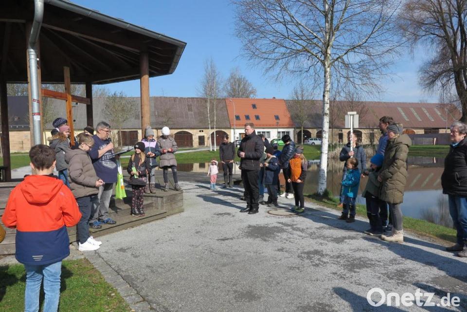 An jeder Station wurde an den Leidensweg Jesu Christi erinnert. Gemeindereferent Jochen Gößl forderte die Kinder zu Aktionen auf. Sie sollten zwei Stöckchen sammeln und diese mit einer Schnur zu einem Kreuz zusammenbinden. Als Zeichen für den Glauben an die Auferstehung wurden Blumen an dieses Kreuz gebunden.