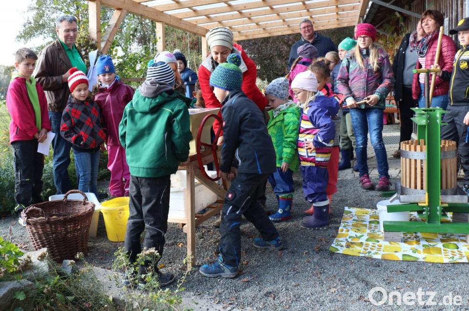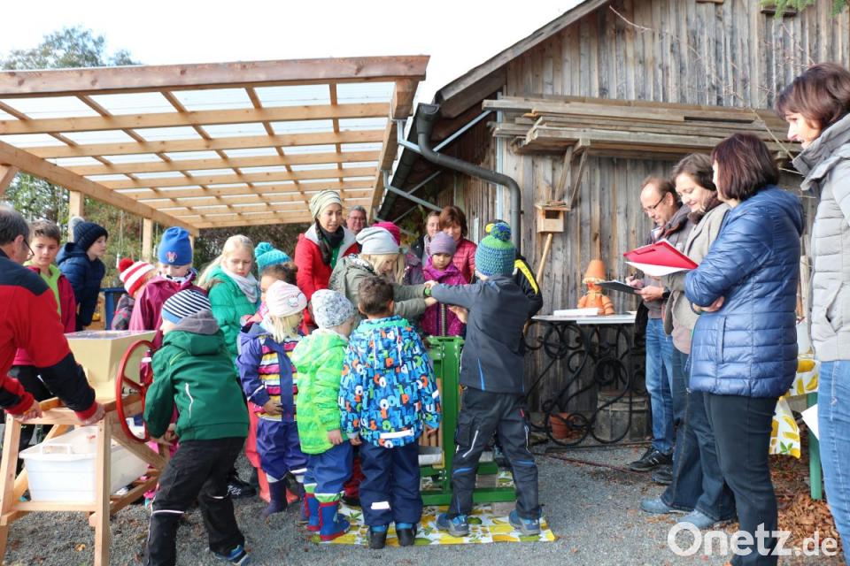 Dann wurden sie Zeugen des sogenannten „Einfütterns der Bienen“. Nach der Entnahme von Honig muss ihnen der Imker Ersatz für den Winter bieten. Die Kinder trauten sich ohne Angst an das geöffnete Bienenhaus heran. Ganz wagemutige streichelten sogar eine Biene. Nach der Saftpressaktion im September hieß es nun „Knack die Nuss!“ Mit Hammer und Nussbrett setzten die Kinder diese Aufforderung sofort um. Die Nüsse wurden anschließend mit Honig und Schokolade zu leckeren Äpfeln in Alufolie gepackt und im Lagerfeuer gebraten. Den Apfelsaft pressten sie wieder frisch. Auch die Jurymitglieder durften probieren, nachdem sie selbst mit Hand angelegt hatten.