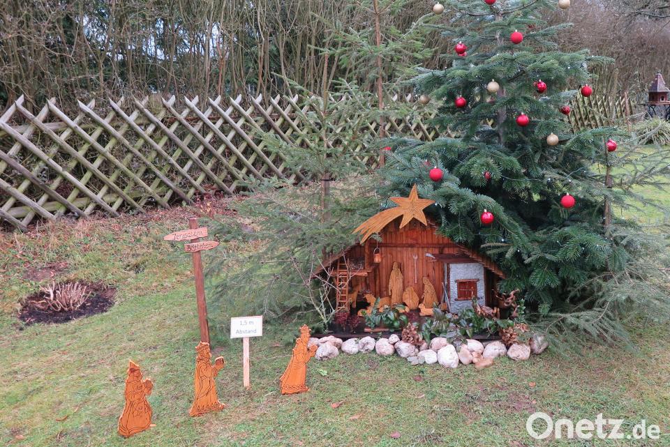 "Auch die Heiligen Drei Könige müssen sich an die geltenden Coronaregeln halten", schmunzelt Herbert Kusche, wenn er Passanten seine Krippe im Garten zeigt. "1,5 Meter Abstand" steht auf einem Schild am Weg, von Kaspar, Melchior und Balthasar zur Krippe. "Die Krippe habe ich selbst gebastelt. Meine Frau Rosemarie hat mich dabei nach Kräften unterstützt", erzählt Kusche.