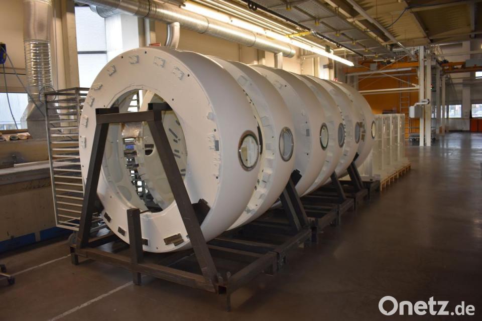 Lackiert werden am Standort in Kemnath vor allem Komponenten aus der Medizintechnik. Diese fahren durch diverse Kabinen, wo sie ihren Farbmantel erhalten. "Die Medizintechnik ist ein wachsender Bereich. Damit bleiben wir zukunftsfähig", bemerkte Chief Technology Officer (CTO) Peter Schardt. Das aufwendigste Teil, ein Röntgenapparat mit C-Arm (Artis Pheno), muss vier Mal durch die Lackieranlage. "Auf die Oberfläche kommen verschiedene Schichten wie Korrosionsschutz oder antibakterielle Farbe. Bei einer Schicht wird eine ganze Dose Spachtelmasse aufgetragen", weiß der Abteilungsleiter der Oberflächentechnik Frank Pecher. Zudem hängen in der großen Fabrikhalle schwere runde Teile, die später zu Computertomografen verbaut werden. "Sensoren sind zum Beispiel an der Aufhängung angebracht. Sie registrieren, in welchem Arbeitsschritt sich das jeweilige Teil befindet", erklärt Pecher.