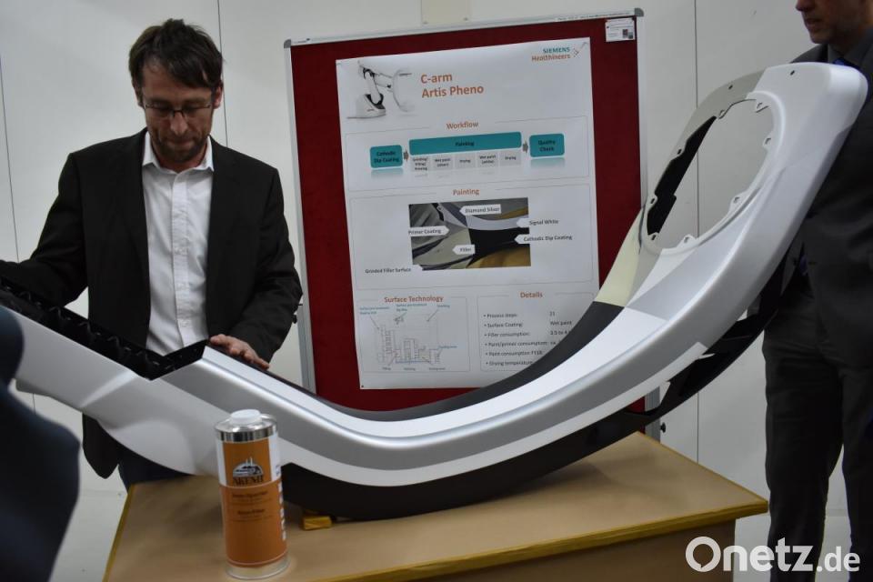 Die neue Lackieranlage von Siemens Healthineers arbeitet nur noch auf zwei Drittel der vorherigen Fläche. „Was wir mit dem restlichen Platz machen, wissen wir noch nicht. Vermutlich kommt er für die neue 3-D-Technik zum Einsatz“, sagte Standortleiter Michael Braunreuther. Obwohl weniger Platz zur Verfügung steht, hat die Anlage einen höheren Output und 30 Prozent mehr Kapazität.