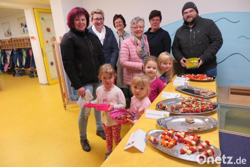 Das Befüllen von Brotzeitboxen und das Probieren gesunder Pausenbrotalternativen standen im Mittelpunkt. Jedes Kind durfte sich seine mitgebrachte Brotbox vom Büfett füllen. Mit Hilfe von Kita-Eltern stellten Barbara Michalski, Referentin im Netzwerk, und Fachlehrerin Petra Prölß ein abwechslungsreiches Büfett zusammen. Zur Auswahl standen Vollkornbrot mit Käse und Obst, Gemüsesticks mit Quark-Dip, Brotspieße mit Frischkäse und Gemüse, Vollkornbrot mit Leberwurst-Quark-Aufstrich und Piratenspieße. Die selbst hergestellten kalorienarmen Durstlöscher, Biene-Maja-Tee, Traubentee und Apfellimonade, kamen bei den Kindern gut an. Das Rezeptheft "Gesund und fit im Kinder-Alltag" zu den Frühstückstagen konnten die Eltern kostenlos mit nach Hause nehmen.