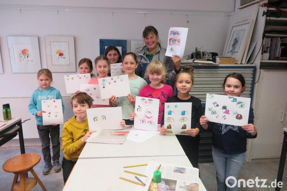 Kunsterzieherin Susanne Vonhoff bietet an jedem ersten Samstag im Monat in ihrem Atelier an der Stadtmauer zwei Malkurse für Kinder an. Diesmal waren acht Mädchen und ein Junge gekommen, um ein menschliches Auge zu malen. Anhand von Farbtafeln erklärte Vonhoff die Beschaffenheit und den Aufbau des Sinnesorgans mit Glasapparat, Iris, Pupille (Sehloch), Ober- und Unterlied, den beiden Augenwinkel und den Wimpern.