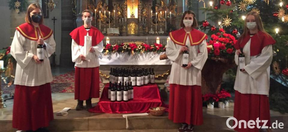 „Trink die Liebe des heiligen Johannes“ stand auf den Weinflaschen, die Stadtpfarrer Thomas Kraus in den Gottesdiensten in der Kemnather Stadtpfarrkirche segnete. „Herr und Gott, du schenkst uns den Wein als Frucht der Erde und der menschlichen Arbeit“, betete er. „Segne diesen Wein, den wir zu Ehren des heiligen Johannes trinken, und lass uns erfahren, dass du der Gott bist, der die Herzen der Menschen froh macht und Gemeinschaft stiftet.“ Nach den Gottesdiensten verkauften Ministranten die Weinflaschen. Der Erlös ist für die Ministrantenkasse bestimmt.