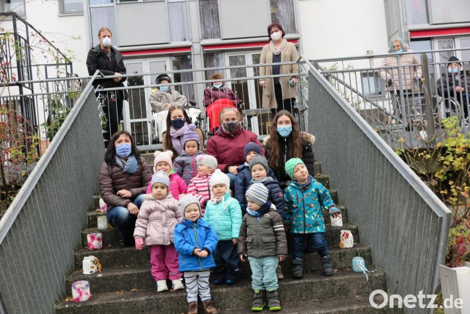 Wegen der verschärften Corona-Maßnahmen durfte diese kleine Martinsfeier aber nicht im Haus stattfinden. Sie musste im Garten vor der Hauskapelle an der Terrasse über die Bühne gehen. Erzieherin Christine Tanner begrüßte die erwartungsvollen Heimbewohner. Mit dem Lied "Tragt in die Welt nun ein Licht, sagt allen, fürchtet euch nicht" stimmten die Kinder die Senioren auf das Martinsfest ein. Es folgten die Laternenlieder "Laterne, Laterne, Sonne, Mond und Sterne" und "Ich geh mit meiner Laterne und meine Laterne mit mir".