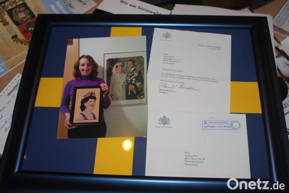 Sehen werden die Besucher zudem ein Dankesschreiben von Schwedens König Silvia. Zu deren 40. Hochzeitsjubiläum 2016 hatte ihr die Mitterteicherin ein selbst gemachtes Mosaikbild der Monarchin geschickt. Warum? Weil 1976, kurz nach der Heirat mit König Carl XVI. Gustaf, der Song "Dancing Queen" erschienen sei, erklärt sie. Nicht wundern darf man sich über die Fischkonserven unter den Exponaten, denn deren schwedische Herstellerfirma heißt Abba. Diese wollte aber nicht mit der Popgruppe in Verbindung gebracht werden, weiß Doß.