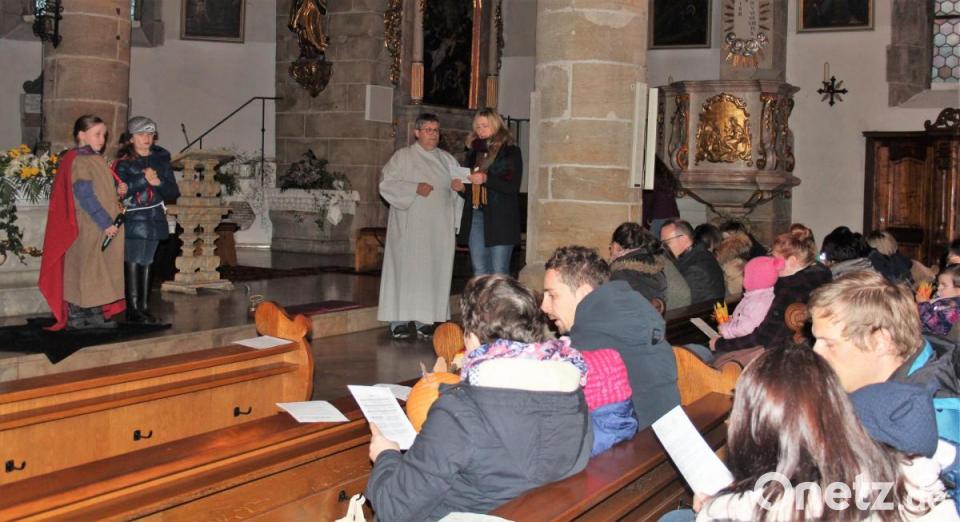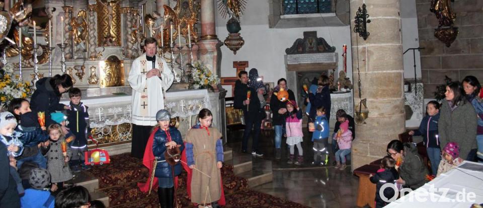 Zahlreiche Kinder, Eltern und Großeltern waren gekommen, um mit Pfarrer Thomas Kraus, Pastoralreferent Jochen Gößl sowie Organisatorin Renate Pressler an die Legende des Heiligen zu erinnern. In einem Spiel im Altarraum erzählten Anna Wöhrl als Martin und Mona Völkl als Bettler das Wirken des Heiligen nach. Zudem zogen die Mädchen und Buben zu bekannten Martinsliedern mit ihren Laternen durch das Gotteshaus. Im Anschluss ging es zur Feier ins Pfarrheim, wo Essen und Trinken auf die Teilnehmer warteten.