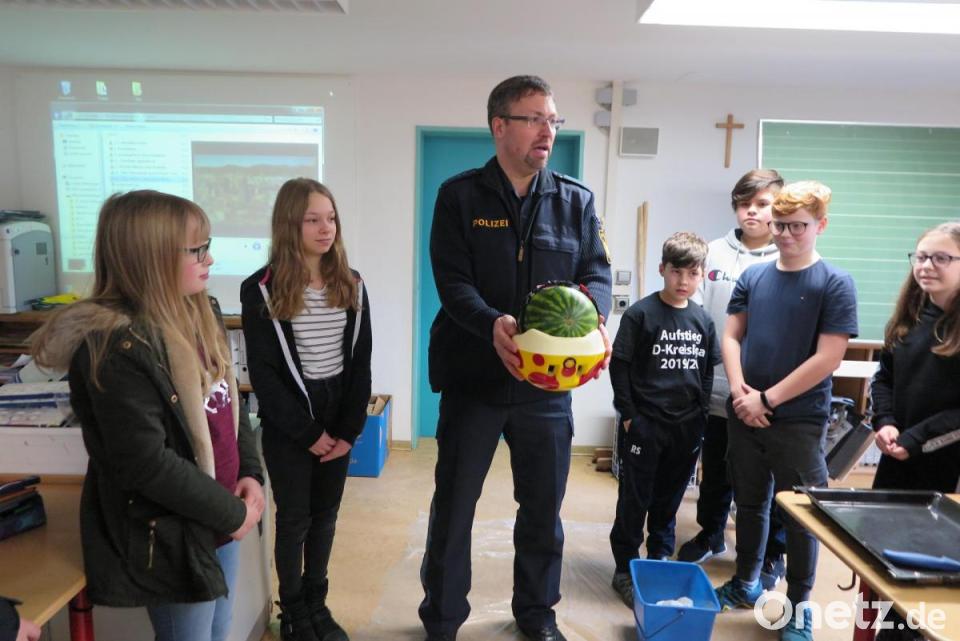 "Der beste Beweis für die schützende Wirkung eines Fahrradhelms ist der sogenannte Melonentest", kündigte Landgraf an. Dabei schnallte er einer Wassermelone einen ein Helm um und ließ sie aus etwa einem Meter Höhe fallen. Den Versuch wiederholte der Polizist ohne Fahrradhelm, wobei die Melone zerplatzte. Nach dieser eindrucksvollen Präsentation teilte der Beamte die Früchte in mehrere kleine Teile auf und verteilte diese zum Essen.