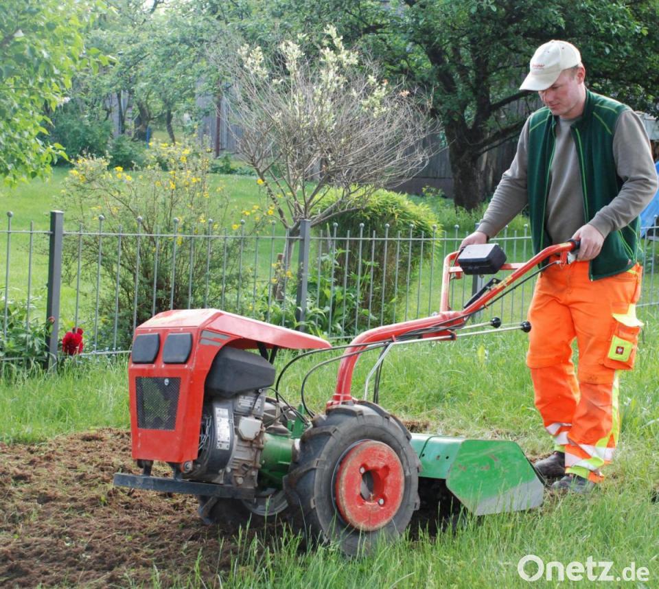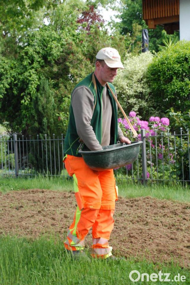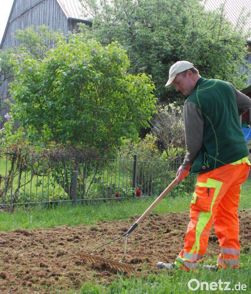 Acht Uhr morgens in Guttenberg am Flurbereinigungsdenkmal. Nach Kemnath, Atzmannsberg, Kastl, Köglitz, Waldeck und Schönreuth ist Guttenberg heute die letzte Station des Stadtgärtners Florian Frank. Sein Plan: die Anlage eines Blühstreifens im Ortskern. Mit der Fräse hat er die Fläche, ein Areal von ungefähr vier mal zwei Meter bereits bearbeitet, jetzt ist er gerade mit dem Rechen zugange, um größere Steine zu entfernen und den Boden zu planieren.