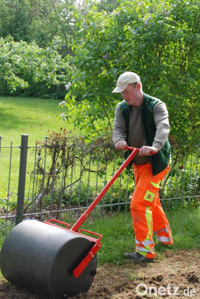 Inzwischen hat Frank für den letzten Arbeitsgang die Walze vom Transporter geholt und schiebt sie mehrmals über die offene Fläche, um den Bodenschluss des Saatguts und damit die Wasserversorgung für die Keimung und Entwicklung sicher zu stellen. So, fertig. Jetzt muss es eigentlich nur noch regnen. Der Stadtgärtner blickt skeptisch nach oben: Blauer Himmel, Sonnenschein. Es sieht nicht nach Regen aus. Aber darum kann sich Florian Frank nicht auch noch kümmern. „Ich mach dann mal weiter“, sagt er und beginnt, seine Geräte wieder auf den Hänger zu laden. Schaut fast so aus, als ob die Sache mit dem Regen an den Guttenbergern hängen bleiben würde.