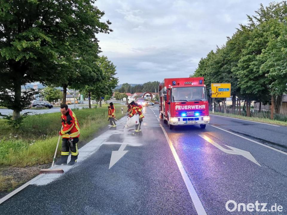 Im Bereich des Gewerbegebiets war es aufgrund eines Motorschadens an einem Auto zu einer mit Öl verunreinigten Fahrbahn gekommen. "Bedingt durch die regennasse Fahrbahn und den Fahrzeugverkehr verunreinigte das ausgelaufene Motorenöl die Straße auf einer Länge von rund 150 Metern auf einer Fahrspurbreite", heißt es von der Feuerwehr. Zehn Kräfte waren mit drei Fahrzeugen angerückt. Für rund eine halbe Stunde war die Bayreuther Straße ortsauswärts gesperrt. Die Einsatzstelle wurde abgesichert, Ölbindemittel aufgebracht, die Ölspur abgebunden und die Fahrbahn gereinigt. Die Straßenmeisterei errichtete Warntafeln - die Kemnather Polizei nahm den Vorfall auf.