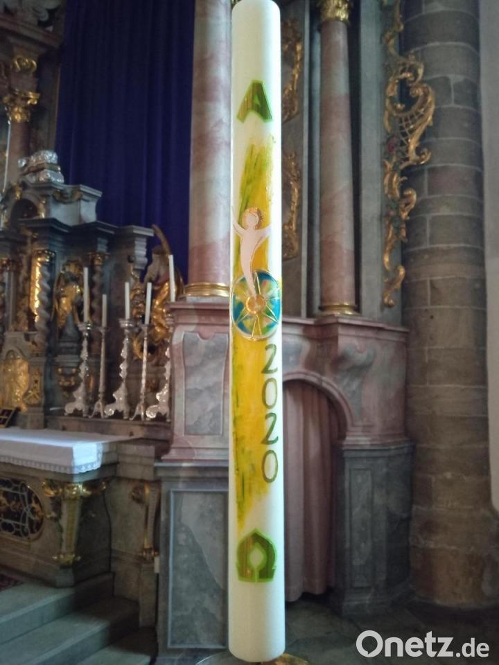 Die große Osterkerze in der Stadtpfarrkirche soll auch die Hoffnungsbotschaft der Erstkommunion widerspiegeln. Ihr Licht leuchtet ein ganzes Jahr lang wieder in den schönen und schweren Stunden, die vor den Gläubigen liegen werden und gibt ein tröstliches Zeugnis von Jesus Christus, dem Licht der Welt.