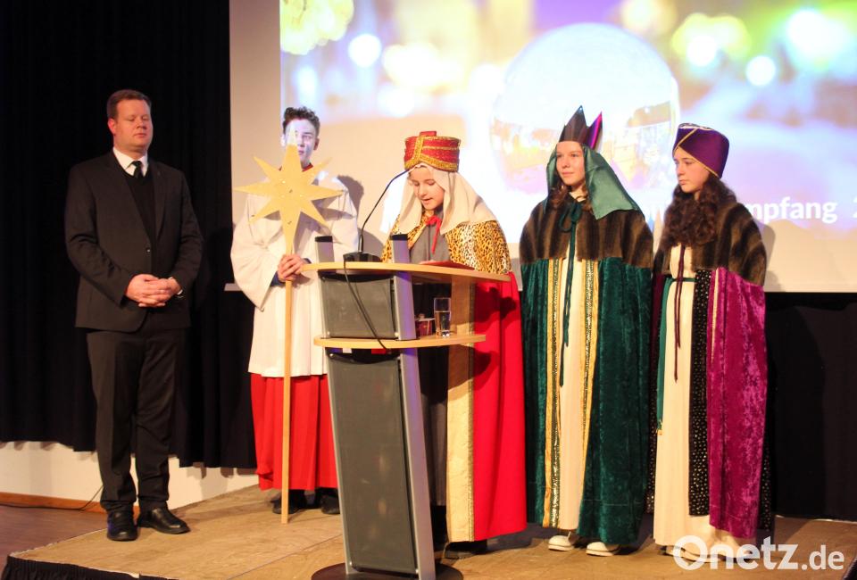 Rund 200 geladene Gäste waren es, die am Donnerstagabend den Weg ins Foyer der Mehrzweckhalle gefunden hatten. Begrüßt wurden sie beim Eingang dreifach: mit einem Glas Sekt oder Orangensaft, drei echten - glücksbringenden - Schornsteinfegern sowie Shakehands von Bürgermeister Roman Schäffler und seiner Ehefrau Petra.