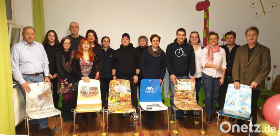 Das Mitarbeiterteam der Beratungsstelle für Kinder, Jugendliche und Eltern in Weiden hatte für Leiter Gunter Hannig einen Fotografen-Stuhl zum 60. Geburtstag bestellt. Raimund Panzer vom städtischen Bauhof erhielt zum Ruhestand einen "Rastplatz". Die AXA-Wagner-Versicherung aus Kastl wünschte sich einen Logo-Stuhl für ihr Büro. Thomas Speierl von der Fischereiberatung des Bezirks Oberfranken hatte für Hans Klupp, Gründer der Arge Fisch, einen Karpfen-Stuhl in Auftrag gegeben. Die Bäckerei Krauß und Obst Celik erhielten zwei besondere Sitzgelegenheiten für ihre Geschäfte. Beide Firmen unterstützen das Familienzentrum seit der Gründungszeit.