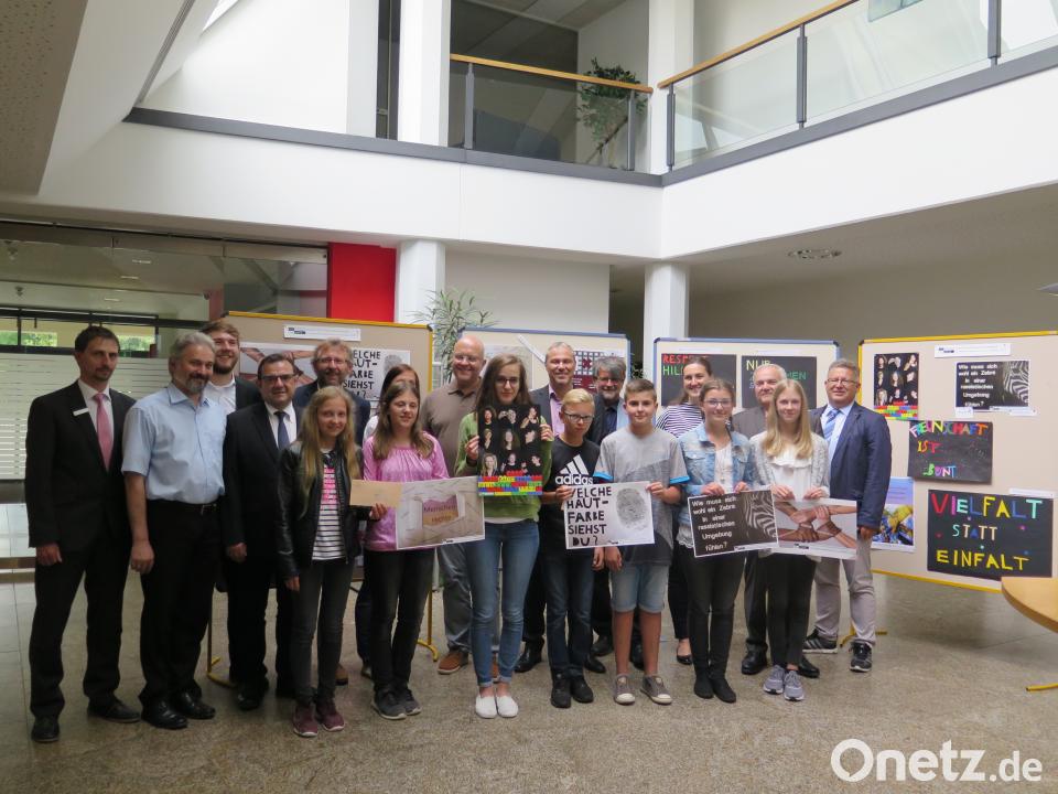 Nicht nur Realschulrektor German Helgert und stellvertretender Landrat Günter Kopp (hinten von rechts) bewundern die Ergebnisse des Plakatwettbewerbs bei der Eröffnung der Ausstellung in der Sparkasse Oberpfalz Nord. Mit ihren sehr kreativ gestalteten Arbeiten wollen die Preisträger (vorne) die Betrachter zum Nachdenken anregen.