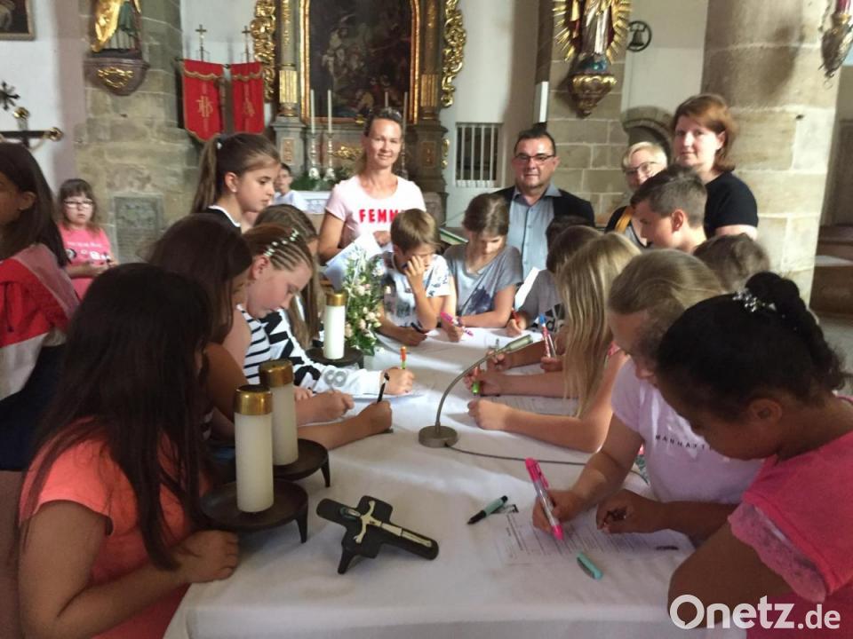 "Unsere Stadtpfarrkirche Mariä Himmelfahrt wurde im Jahr 1448 erbaut", erzählte Stadtpfarrer Konrad Amschl. Die Jahreszahl sei über dem linken Eingangsportal in Stein gemeißelt, die Zahl 1506 in einem Rautenwappen auf der Brüstung der Empore stehe sicher das Jahr der Bauvollendung. Inzwischen sei der Pfarrsitz von Oberndorf nach Kemnath verlegt worden. Der 58 Meter hohe Turm neben dieser spätgotischen Hallenkirche sei erst später gebaut worden, der barocke Hochaltar folgte 1644. Das Altargemälde stelle die Aufnahme Mariens in den Himmel dar. Das Patrozinium der Pfarrkirche "Mariä Himmelfahrt" werde stets am 15. August begangen, erzählte Amschl. Staunend standen die Schüler vor dem Glasschrein unter der Altarmensa mit der Reliquie des heiligen Primian. Natürlich durften die Kanzel mit dem Schalldeckel und den zehn Geboten, der Ambo und der Taufstein bei der Kirchenführung nicht fehlen.