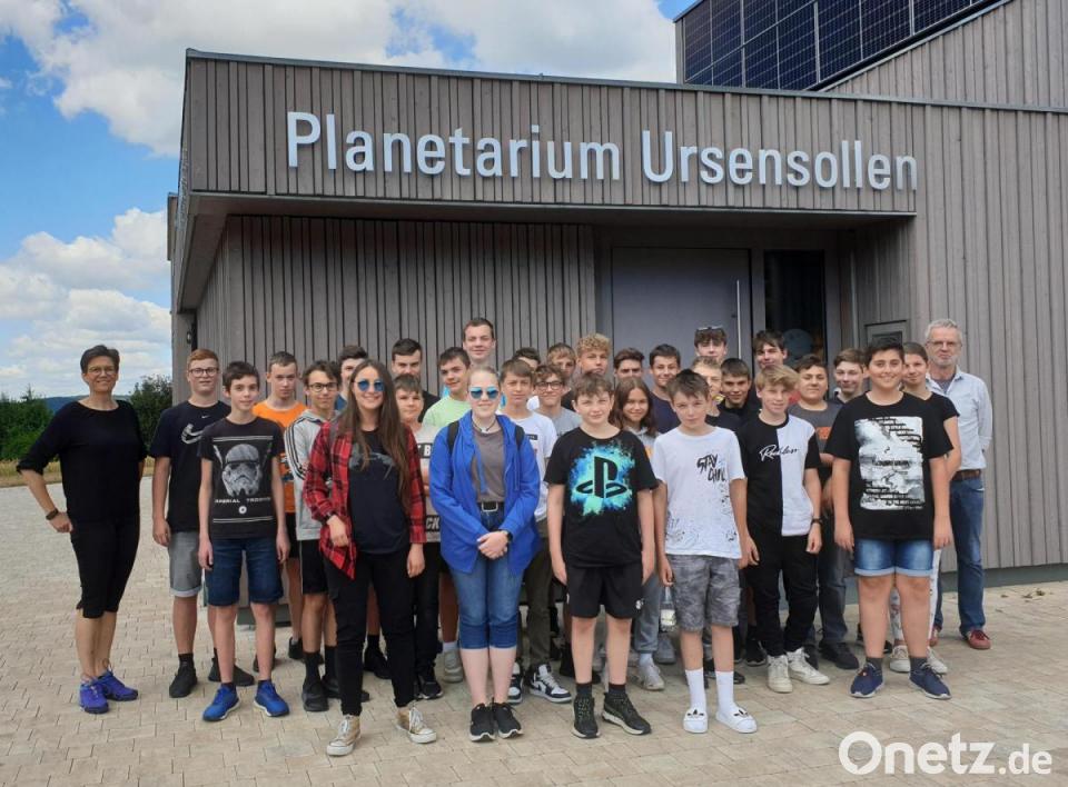 Da der Lehrplan im Fach Physik der 8. Jahrgangsstufe (Wahlpflichtfächergruppe I) das Themengebiet Astronomie vorsieht, besuchten die Schülerinnen und Schüler der Klassen 8A/B und einige Siebtklässler, die an den Physik-Übungen teilgenommen haben, das Planetarium Ursensollen. Begleitet wurden sie von den Physiklehrern Susanne Heining und Ralf Bäuml.
