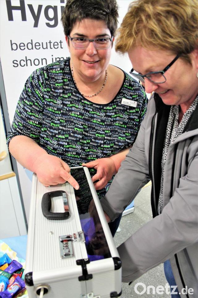 Interessierte konnten danach in einem Koffer unter Schwarzlicht direkt überprüfen, wie wirksam sie ihre Hände desinfiziert hatten und wo noch Lücken bestanden. Hinweise zur Handpflege und zum Hautschutz rundeten das Thema ab. Darüber hinaus bestand Gelegenheit, sich den Hautzustand - beispielsweise ob es sich um eine trockene Haut handelt - der Hände analysieren zu lassen.