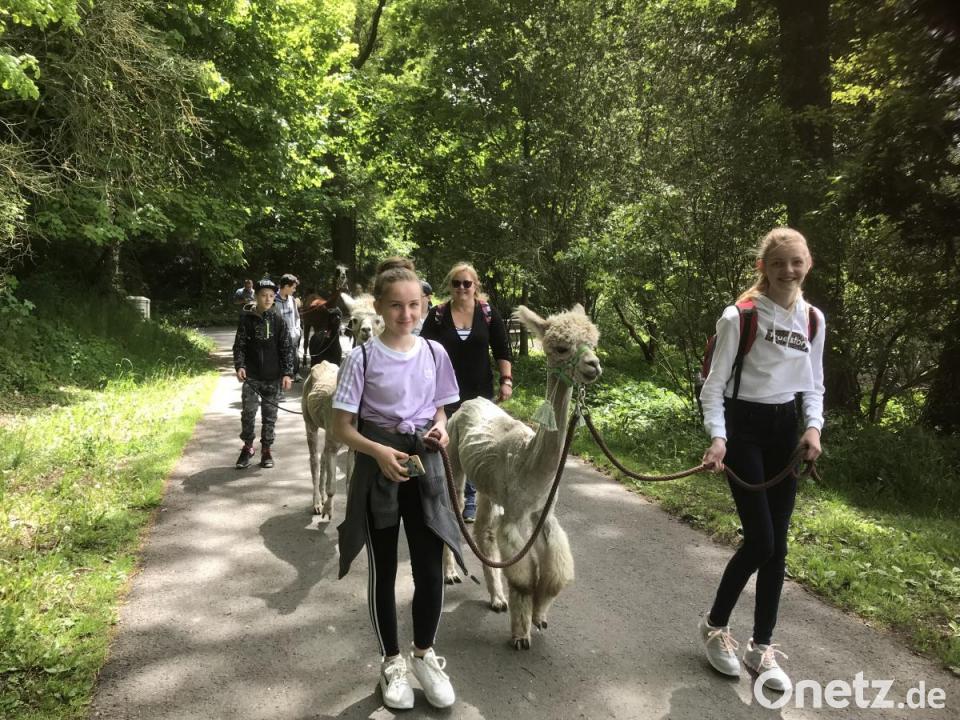 Sie beschrieb auch deren Charakter, so dass sich jeder schon überlegen konnte, welches Tier wohl am besten zu ihm passen würde. Nach einer ersten Kennlernphase mit gegenseitigem Beschnuppern ging dann die Wanderung in gemächlichem Tempo von der Lama-Wiese in Richtung Lourdes-Grotte los. Bei strahlendem Sonnenschein machte es allen großen Spaß und am Schluss trauten sich alle Schüler, ein Alpaka an der Leine zu führen. Alle Berührungsängste waren überwunden, auch beim Füttern der Tiere. Bei einigen der 17 Schülern schien es "Liebe auf den ersten Blick" zu sein. Alle verabschiedeten sich nur schweren Herzens von ihren Tieren, die sie geführt hatten.