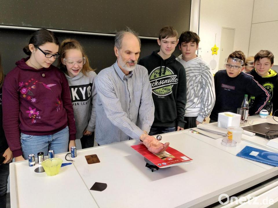 "Physik zum Anfassen und Ausprobieren" bot Kay Kublenz den Schülern der Klasse 8M8 der Mittelschule Kemnath. In seinem ganz speziellen Unterricht in PCB (Physik/Chemie/Biologie) staunte selbst Klassenlehrerin Heidrun Schelzke-Deubzer. "Nach acht Jahren war er wieder einmal im PCB-Unterricht in meiner Klasse", freute sie sich. Auch diesmal begeisterte er die Jugendlichen mit seinen Versuchen zum Thema Magnetismus. "Durch die Abstoßung und Anziehung der beiden Plus- und Minus-Pole kann man es schaffen, dass eine Kugel scheinbar schwerelos in der Luft schwebt", kündigte er an. Und tatsächlich - wie von Zauberhand gehalten, schwebte die Kugel elf Minuten lang in der Luft. "Das bedeutet für mich eine neue Rekordzeit", freute sich Kublenz. "Das ist aber kein Trick und keine Zauberei, sondern beruht auf dem Prinzip der magnetischen Abstoßung", verriet er den Achtklässlern.