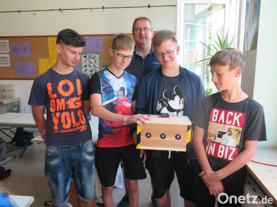 (jzk) Ein besonderes Projekt hat Lehrer Thomas Seitz mit vier Schülern seiner Klasse 7a umgesetzt. Zusammen mit Joshua Heining, Felix Kopp, Enrico Spiersch und Tobias Müller baute er eine Solar-Auflade-Station für Geräte, die einen USB Anschluss haben. Von den 16 I-Pads der Mittelschule können sechs gleichzeitig aufgeladen werden. Gespeist wird das Gerät von einer Solarzelle, die sie außerhalb des Klassenzimmers auf einem Fensterbrett angebracht haben. Für diese Leistung zeichnete sie Siemens-Healthineers-Standortleiter Alfred Koch mit dem MINT-Preis aus, der erstmals an eine Mittelschule ging.