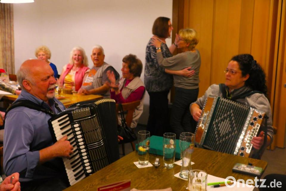 Auch Josef Zaglmann griff zu seinem Akkordeon. „Ihr dürft bei dem Lied vom ,armen Dorfschulmeisterlein’ nicht alles für bare Münze nehmen“, verriet er seinen Zuhörern. Gerd Retzer aus Vorbach hatte seine Lebensgefährtin Helga Dollhopf aus Wirbenz mitgebracht. Nach dem besinnlichen Stück „Glocken der Heimat“ spielten sie „Jeder Tag bringt neue Hoffnung“, „Schau den Wasserfall“, „Rauschende Birken“ und „Der alte Jäger“. „Aber dich gibt’s nur einmal für dich“ versicherte Willi Prechtl aus Fichtelberg seinen Zuhörerinnen. Der begeisterte Saxofon-Spieler mach seit 70 Jahren Blasmusik. Als er beim Spielen eine Pause einlegte, wagte er mit einigen seiner weiblichen Bewunderern ein Tänzchen. Herbert Storek spielte auf seiner Steirischen Harmonika unter anderem das „Achensee Walzerlied“. Mit seiner Bassklarinette begleitete er Erwin Hornauer und Helmut Jilg. Werner Ponnath aus Immenreuth und Dieter Paulus aus Eschenbach hatten ihre Tiroler Ratschn mitgebracht.