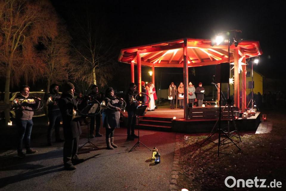 Eingeleitet wurde sie mit dem Choral "Wir sagen euch an den lieben Advent", den die Kaibitzer Schloßbläser unter der Leitung von Hornmeister Ely Eibisch spielten. Ihre Musik und die Beleuchtung des Pavillons sorgten für eine feierliche Stimmung. Maria Wende, Ina Memmel, Sigrid Reger-Scharf, Katrin Pasieka-Zapf, Waltraud Müller, Luzia Söllner und Robert Baier trugen besinnlichen Texte vor, die die Gläubigen beider Konfessionen auf das Weihnachtsfest einstimmen sollten. "Unser Alltag ist noch immer von der Corona-Pandemie bestimmt", sagte eine Sprecherin. Sie forderte alle auf, sich gemeinsam auf Weihnachten einzulassen. Alle sollten entdecken, welche Botschaft Gott an diesem Weihnachtsfest für die Menschen bereithält. "Nicht Gelehrten, Reichen, Mächtigen, Theologen, Politikern, Wirtschaftsbossen, Generälen, Würdenträgern oder Diplomaten wurde die große Freude zuerst verkündet, sondern einfachen Hirten, also Personen am Rande der Gesellschaft", begann eine Meditation.