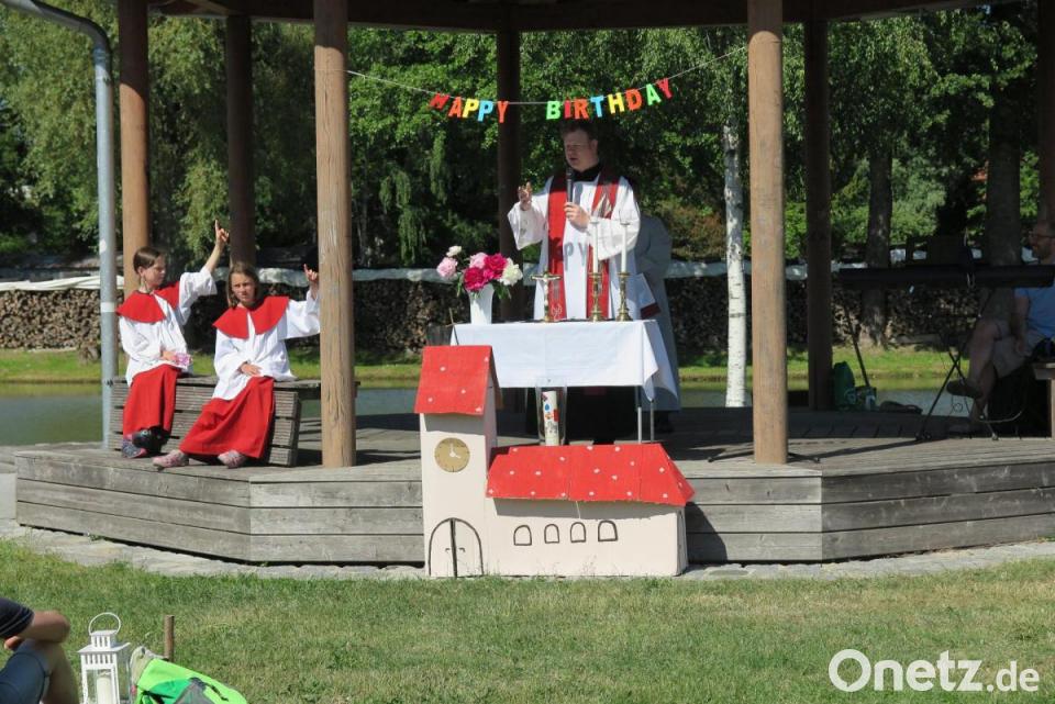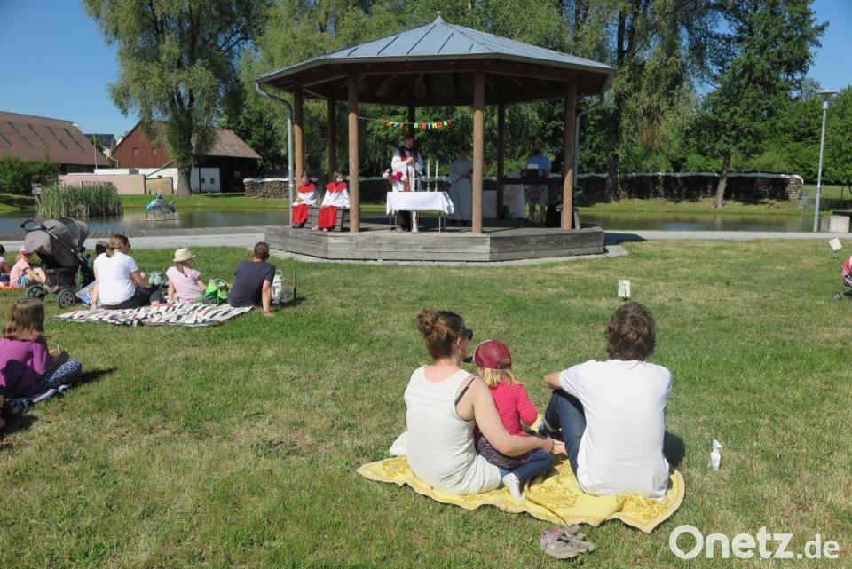Kemnath (jzk) „Es ist schon über 14 Wochen her, dass wir gemeinsam am Faschingsdienstag Gottesdienst gefeiert haben“ erinnerte sich Stadtpfarrer Thomas Kraus, „diesmal sind wir raus aus der Kirche und hierher zum Eisweiher gezogen.“ Mehrere Familien hatten eine Picknickdecke und eine Kerze in einem Glas mitgebracht und machten es sich vor dem Pavillon bequem. Alle freuten sich über das herrliche Sommerwetter. Zuvor mussten sie eine bunte Teilnehmerkarte vorweisen. Die konnte hinten in der Kirche abgeholt werden.