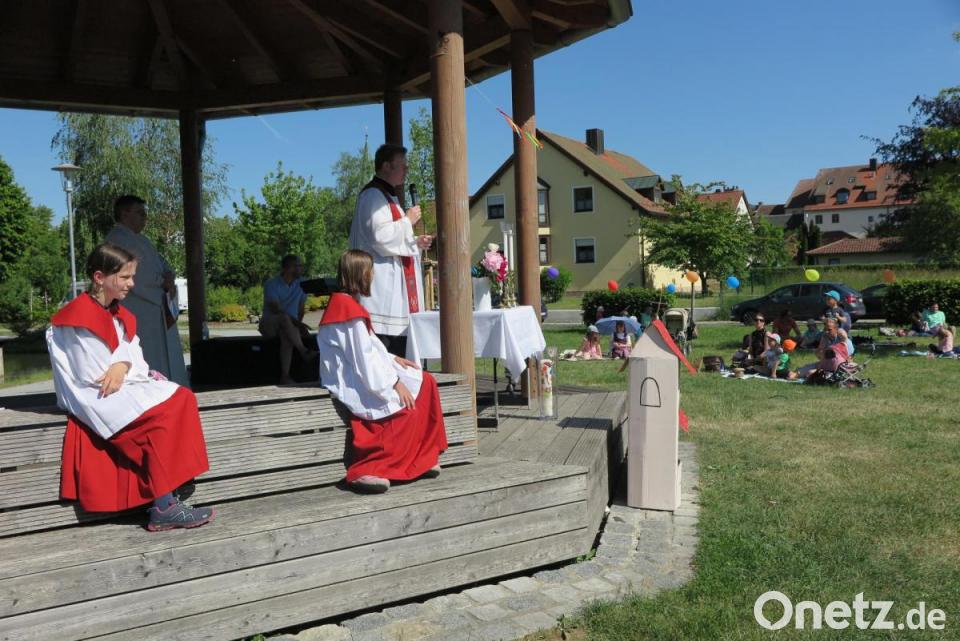 Gleich zu Beginn des Familienwortgottesdienstes erinnerte der Geistliche die Eltern und ihre Kinder an wichtige Regeln in der Corona-Pandemie: „Bleibt als Familie auf eurer Picknickdecke. Dann könnt ihr euren Mundschutz abnehmen.“