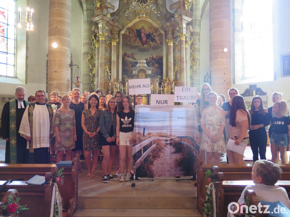 Natürlich gehen nicht alle Träume in Erfüllung. "Aber manche Träume sind es wert, gelebt zu werden, auch wenn man dafür kämpfen muss und sie zunächst unerreichbar erscheinen", betonte eine Schülerin. Nur wer noch Träume und Ziele habe, habe noch nicht aufgegeben. "Lieber Gott, gib der Welt Träume, die uns die Augen öffnen und uns wachrütteln", betete Pfarrer Dirk Grafe vor dem Matthäus-Evangelium. Das handelte vom Wunder der "Speisung der Fünftausend". Grafe empfahl, bei Problemen erst genau hinzuschauen, Hemmschwellen zu überwinden und nicht zu resignieren. "Wer seine Träume lebt, der kann Wunder erleben." Als aktuelles Beispiel führte er die dramatische Rettung der Fußballspieler und ihres Trainers aus der überfluteten Höhle in Thailand an. Die eingeschlossenen Kinder hätten davon geträumt, wieder heim zu kommen, die Eltern davon, ihre Kinder wieder in die Arme zu schließen. "Da haben wir erlebt, wozu Menschen fähig sind, wenn sie an das scheinbar Unmögliche glauben", meinte der Seelsorger. Dazu passte das Lied des Schulchores "Leave a light on". "Hilf uns, die Träume in unserem Leben nicht zu verlieren, denn ohne Träume gibt es keine Hoffnung, kein Leben", lautete eine Fürbitte. Beim Friedensgruß beteten alle: "Schenk uns unseren größten Traum, an dem wir alle arbeiten wollen: den Frieden." Die Volksgesänge begleitete Walter Thurn auf der Kirchenorgel. Beim Sanctus-Lied der Lehrerinnen Anna-Maria Beck, Elisabeth Vogel und Katrin Bayerl-Heß spielte er auf dem E-Piano.