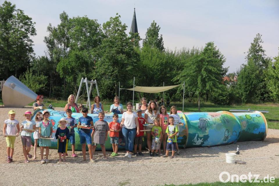 Eine besondere Ferienaktion hatte sich die Kemnather Künstlergruppe "MALWAS" ausgedacht: Sie lud interessierte Kinder und Jugendliche zwischen fünf und zwölf Jahren ein, den Tunnel auf dem Spielplatz beim Fischbrunnen neu zu bemalen. Waltraud Müller, Susanne Vonhoff, Ina Memmel, Maria Wende und Edith Peter mischten die Farben und standen den Buben und Mädchen mit Rat und Tat zur Seite. Zuerst grundierten die Maler die Fläche farbig, dann wurden Phantasiefische aufgemalt. So entstand eine bunte Unterwasserlandschaft, in der sich Fische tummeln. Gleichzeitig frischten die Kinder und Jugendlichen die Farben auf der Seeschlange auf. Sie ist sich in der Nähe der Fischskulpturen "Guvtes", die der Kemnather Künstler Rainer Köhler gestaltet hat. Leider wurde das Holz der langen Schlange durch die Witterung in Mitleidenschaft gezogen. Zweieinhalb Stunden dauerte die kreative Malaktion. Zwischendurch gab es immer wieder kühle Getränke. Wem es zu heiß wurde, der konnte sich im nahen Fischbrunnen beim Ärztehaus kurz abkühlen.