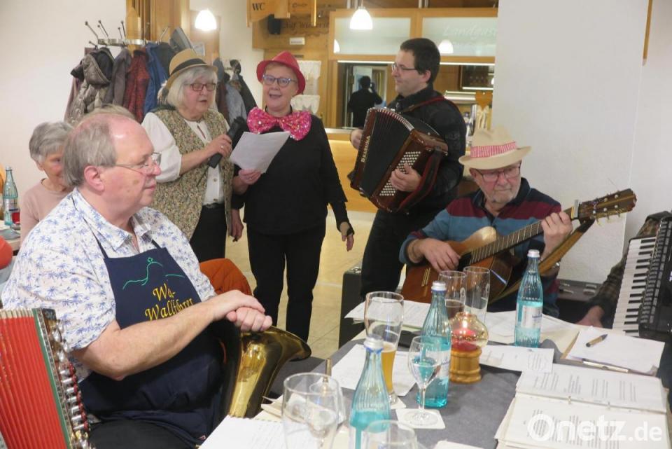 Die Mundartlieder "Tri, tra, hinter der Kellertür" und "Am Tanzbodn geht's lustig zou" gab Herbert Diesner zum Besten. Dabei begleitete er sich selber auf der Gitarre. Mit bekannten Liedern wie "Schön ist die Liebe im Hafen", "Wer soll das bezahlen?" und "Heute blau und morgen blau" sorgten Markus Schraml, Oswald Kopp, Bernhard Bienert, Werner Matt und Rudolf Fink für Stimmung. Der "Ratschn-Toni" (Dieter Paulus) und Werner Ponnath griffen zu ihren Spezial-Ratschn, um den Rhythmus zu verstärken.