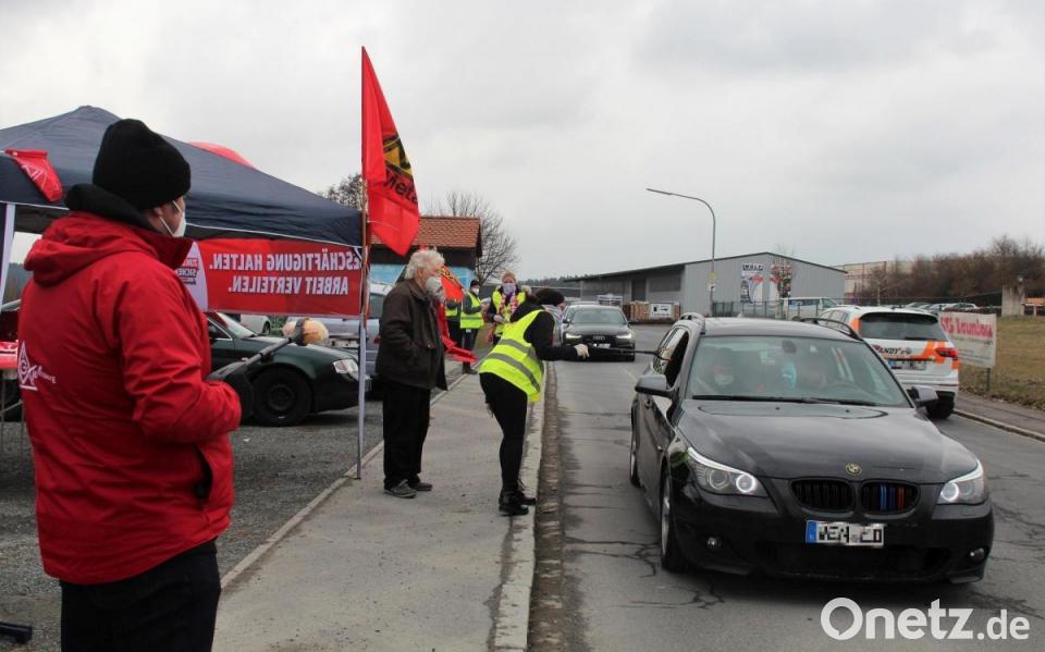 Aufgrund der Corona-Pandemie war keine "klassische" Kundgebung möglich, stattdessen hatten sich die Vertrauensleute am Kemnather Festplatz aufgebaut und versorgten die vorbeifahrenden Beschäftigten der Frühschicht zum einen mit "Leberkäse-to-go-Semmeln" und zum anderen mit aktuellen Informationen.