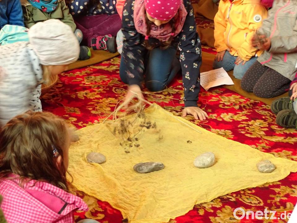 Ein gelbes Tuch in der Mitte sollte eine Wüste darstellen. Die Kinder durften Steine, Dornen und Gestrüpp darauf ablegen. "Auch in unserem Leben ist es manchmal wüst und leer", lautete ein Impuls. Es gebe traurige Augenblicke, in denen wir uns schlecht und elend fühlen wie eine verdorrte Blume in der Wüste. "Aber wir wissen, Gott lässt uns nicht allein", war die tröstliche Antwort.