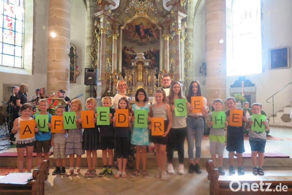 "Wir geben jedem von euch Wünsche mit auf den Weg in die Ferien, damit diese schön und erholsam werden", erklärte Pfarrer Konrad Amschl. Dazu brachten Schüler Ohr, Sonnenblume, Schnur, Klangschale, Herz, Foto und Gummibärchen zum Volksaltar und deuteten sie. "Der Herr möge uns Geduld und Einsicht geben, den richtigen Weg zu erkennen und ihn mit anderen gemeinsam zu gehen" beteten die Seelsorger Dirk Grafe und Amschl. Ihm dankte Rektorin Christine Wiesend für seinen Einsatz als Religionslehrer an der Grundschule. 14 Schüler kamen mit je einem Buchstaben zum Volksaltar, die dann "Auf Wiedersehen" ergaben