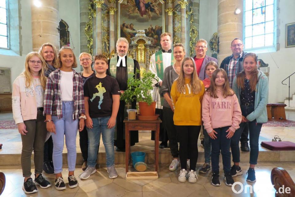 In seiner Ansprache zeigte Pfarrer Dirk Grafe zuerst ein kleines Senfkorn. Dann wies er auf die Senfpflanze vor dem Volksaltar. „Sie wurde vor fünf Wochen gepflanzt und hat sich in dieser kurzen Zeit prächtig entwickelt“, gab der Geistliche bekannt. „'Gott ist schon da, mitten unter uns Menschen', sagt Jesus. Jetzt ist sein Reich noch winzig klein, doch es will wachsen."