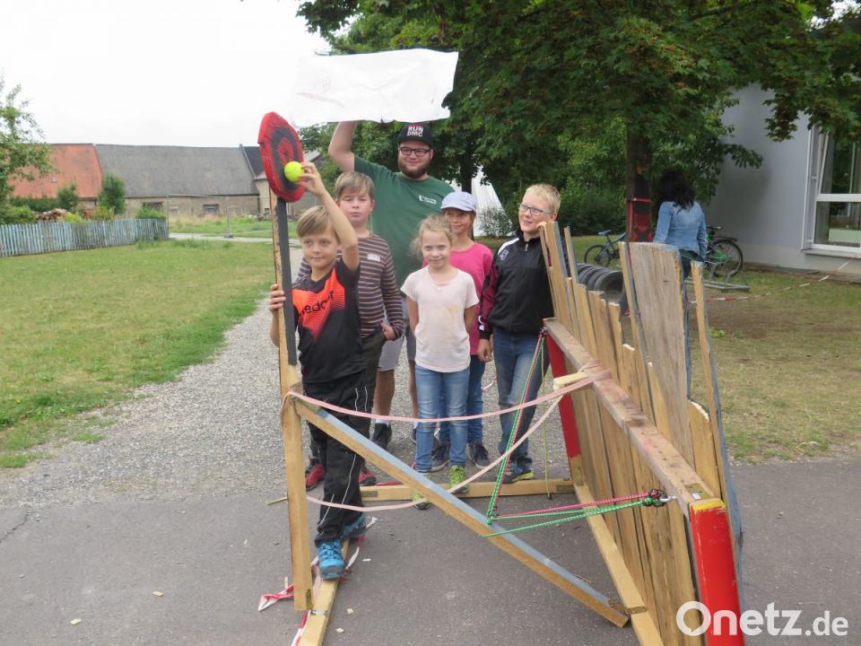Simon spannte den hölzernen Hebel. Als er mit einem Tennisball die Zielscheibe traf, wurden zur Belohnung Gummibärchen in seine Richtung geschleudert. Alle waren glücklich, dass sie ihr selbst gebautes Katapult so reibungslos funktionierte.