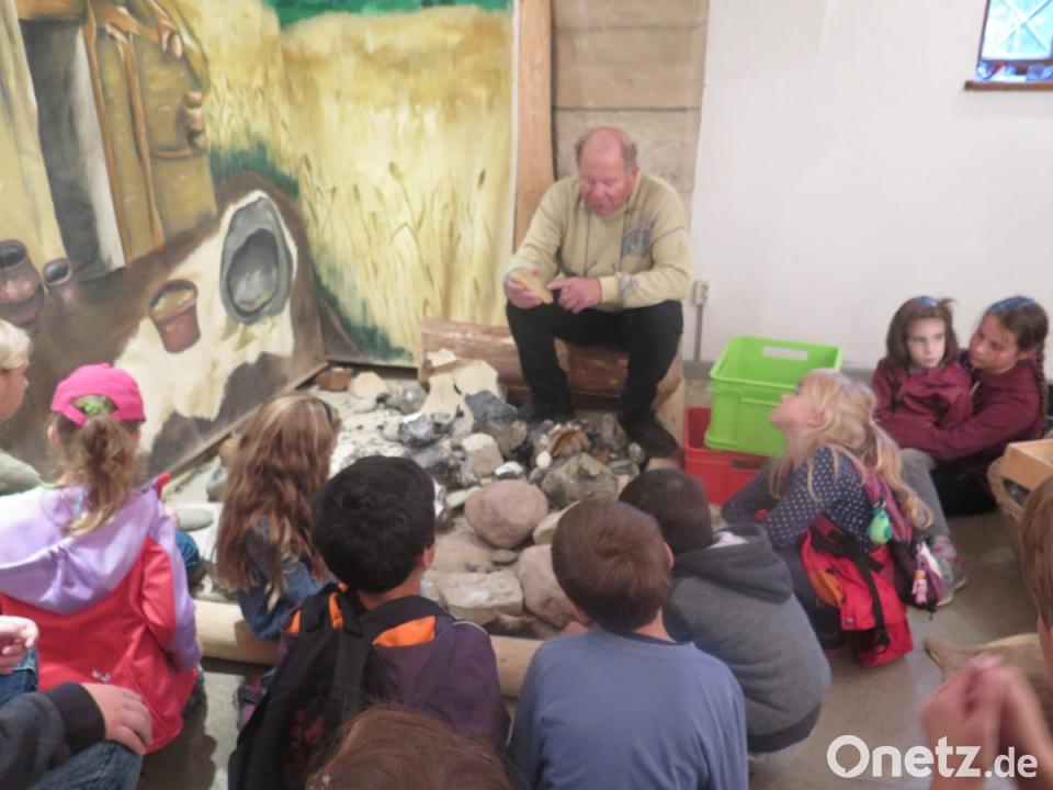 Das nächste Ziel war die vor- und frühgeschichtliche Ausstellung im Erdgeschoss. „Fast alle Epochen der Erd- und Menschheitsgeschichte sind hier durch Fundstücke dokumentiert, die überwiegend aus dem Kemnather Land stammen“, erklärte Bäte den Buben und Mädchen. „Hier könnt ihr Pflanzen- und Tierfossilien, Werkzeuge aus der Stein-, Bronze- und Eisenzeit und Alltagsgegenstände des Mittelalters sehen“, fügte er hinzu. Der erfahrene Museumsführer verstand es von Anfang an ausgezeichnet, mit seinem enormen Sachwissen und seinen anschaulichen Erklärungen, die Kinder in seinen Bann zu ziehen.
